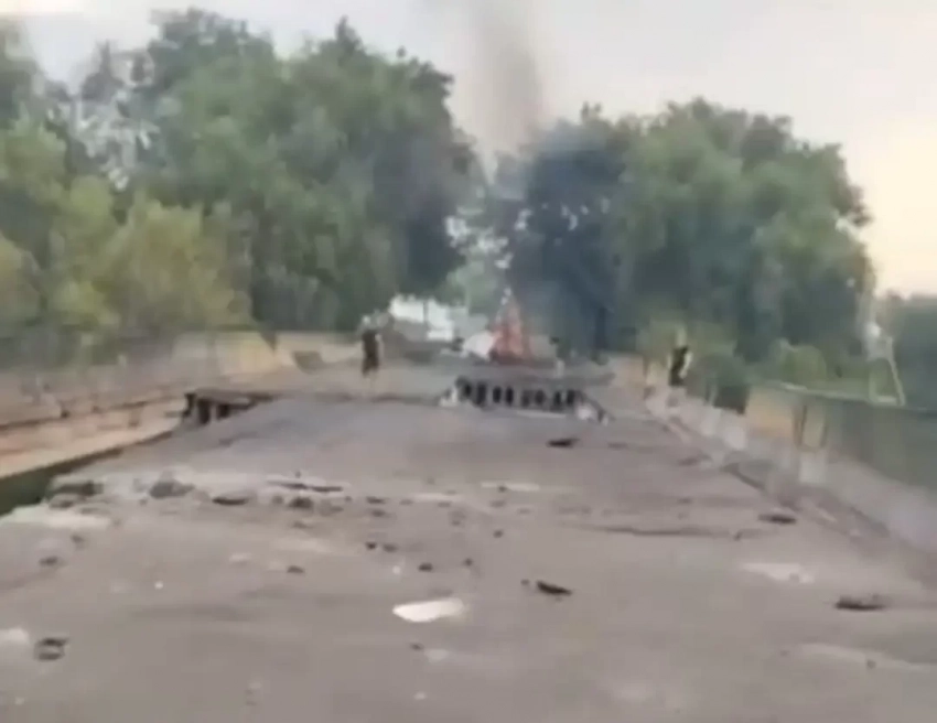 Ранее в сети появились и видеокадры удара по мосту в Великомихайловке, а позже местные жители сняли сам мост, который, как видно, получил значительные повреждения, однако пока еще частично держится, но, очевидно, для прохода тяжелой военной техники он не пригоден. Возможно, для пущей уверенности по нему позже ударят еще раз.