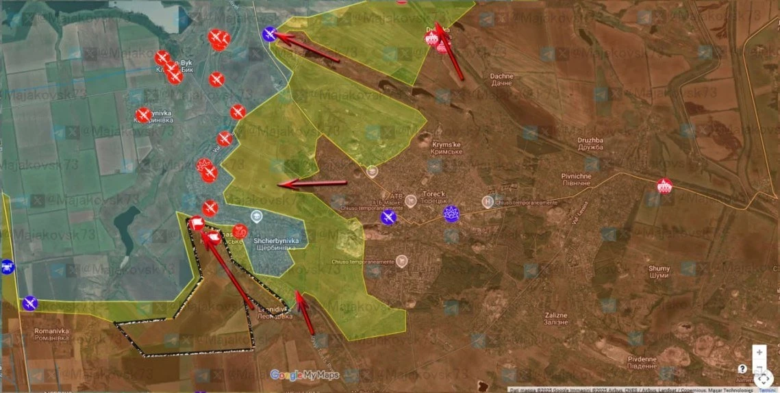На Константиновском направлении российские войска расширили контроль территории западнее Щербиновки, ведут зачистку Новоспасского (Петровки). Продолжаются интенсивные боестолкновения южнее Александро-Калиново и в Яблоневке. ВС РФ ведут штурмовые действия в Русином Яру.