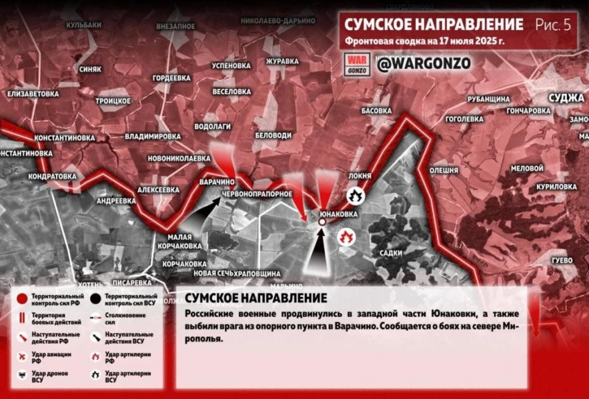 На Сумском направлении российские военные продвинулись в западной части Юнаковки, а также выбили врага из опорного пункта в Варачино. Сообщается о боях на севере Мирополья.