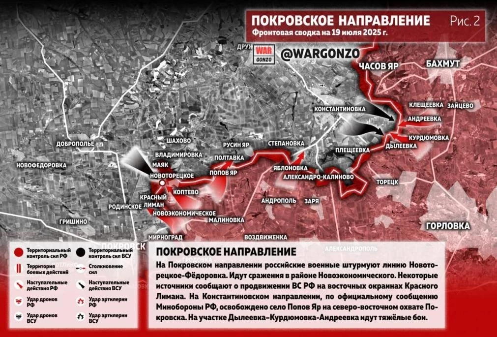 ВС РФ ведут ожесточённые бои севернее Новоторецкого и Фёдоровки на Покровском направлении: свежие данные от 19.07.2025