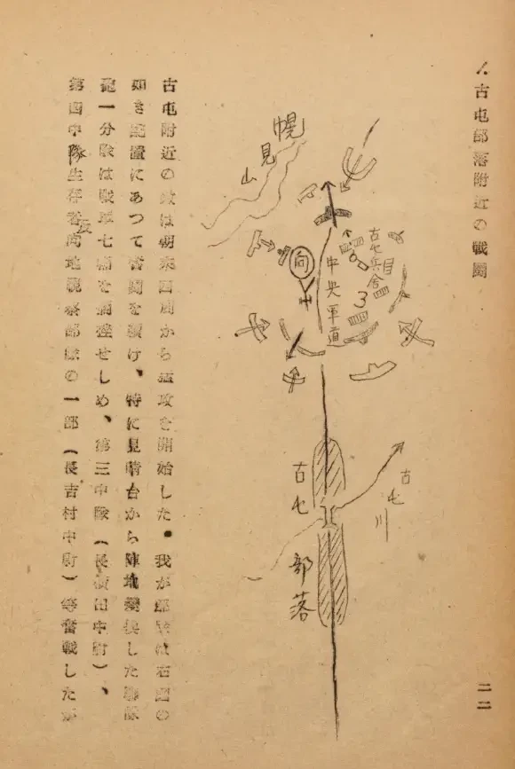Рукописная схема из японского отчета, иллюстрирующая сражение за военную базу в Котоне. Снизу отмечен поселок Котон и река Котон-гава