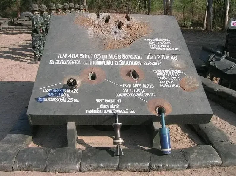 Пороховые метательные заряды для подкалиберных снарядов использовались штатные, но с изменённой массой пороха для имитации попадания боеприпасов в цель с расстояния двух километров. Просто никакого смысла с реальных двух километров стрелять нет — ещё и не попадёшь с первого раза. Гораздо дешевле уменьшить количество пороха в заряде, чтобы скорость снаряда была таковой, будто он пару километров пролетел.