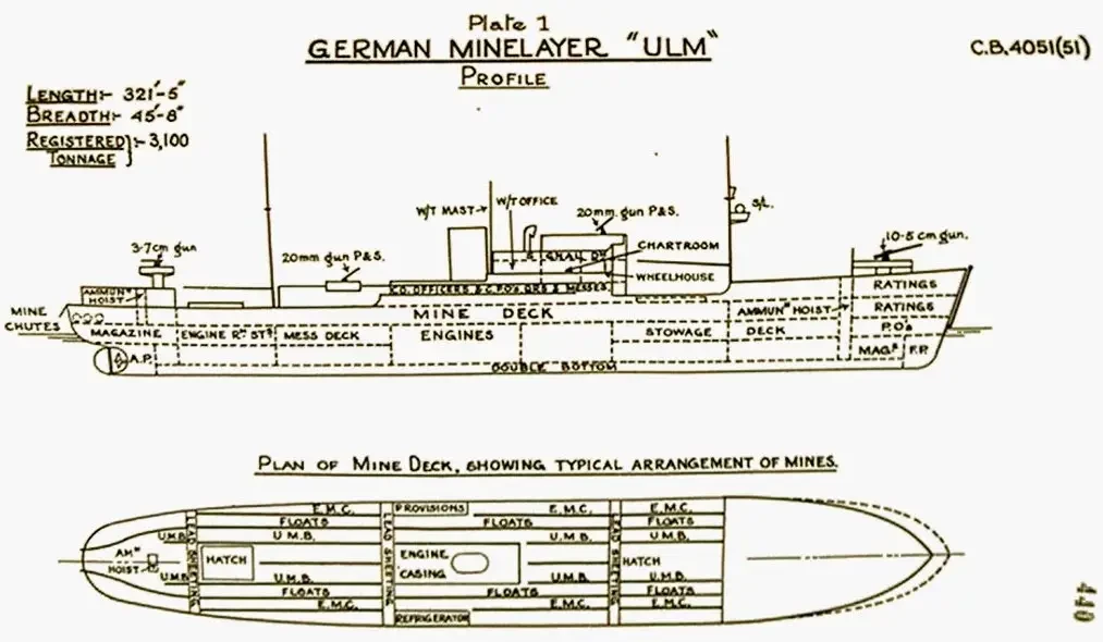 В то же время надводных минных заградителей специальной постройки в Кригсмарине не было, и пришлось переоборудовать для этой цели паромы и другие торговые суда. Одним из таких минзагов стал «Ульм» (“Ulm”).