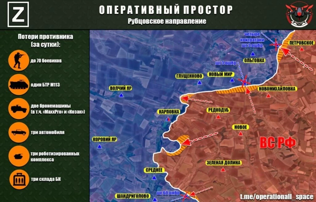 В Сумском приграничье не стихают бои в Кондратовке: ВСУ продвигаются на западе от села и пытаются вытеснить наших к его южным окраинам. Российские войска продолжают пробиваться по дороге на Храповщину между Варачино и Юнаковкой. В самой Юнаковке идут упорные бои на юго-западной окраине. Расширен плацдарм в районе Поповка-Демидовка, у Марьино.