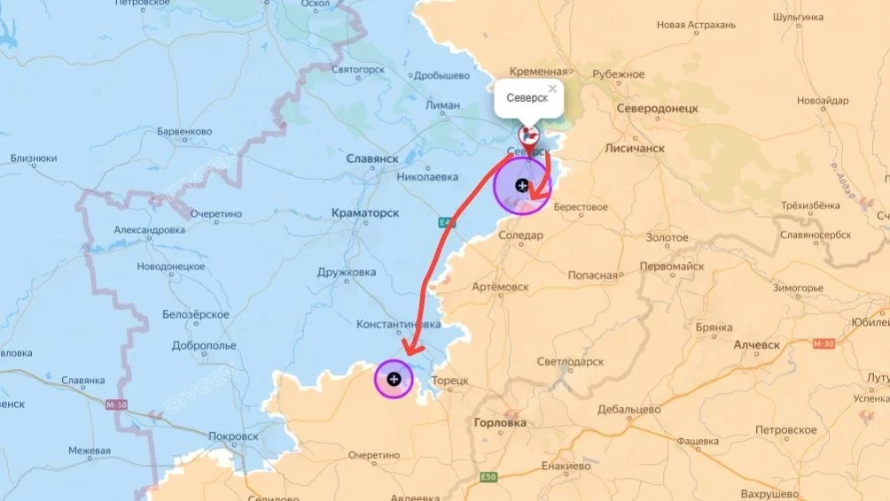 На Константиновском направлении ВС РФ закрепились в юго-западной части Полтавки и продвигаются в северную. Есть версия, что вместо удара по дороге в сторону Константиновки российская армия нацелена на стык между Покровском-Мирноградом и Константиновкой по направлению на Шахово и Торецкое. Если эта версия получит своё подтверждение, это будет означать, что наши войска могут нацелиться на выход в тыл гарнизонам ВСУ в Славянске и Краматорске. На этом же участке село Яблоновка полностью перешло под наш контроль, ВС РФ расширяют зону контроля вокруг. Продолжается наступление наших на север по направлению к Степановке и на восток в Александро-Калиново. На подступах к Александро-Калиново идут тяжёлые бои, наши атакуют с юга, смогли продвинуться до 600 м. ВС РФ взяли под контроль бОльшую часть Щербиновки. На восточном фланге идут бои в Александро-Шультино, а также в районе Леонидовки и Дылеевки.