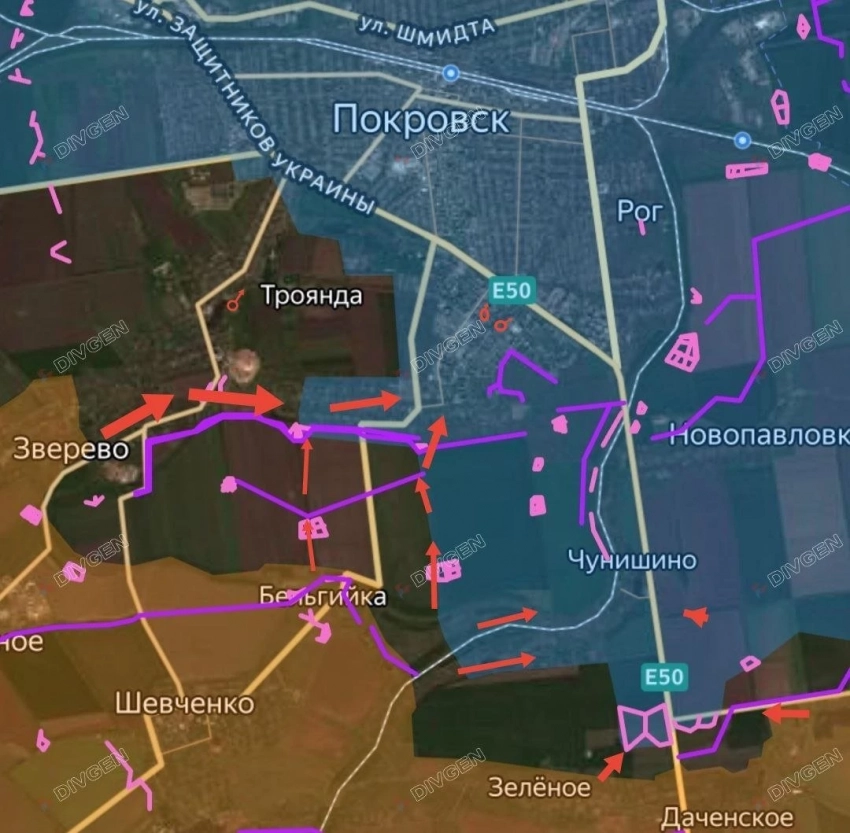 На Покровском направлении наши войска продвигаются между Орехово и Алексеевкой, постепенно закрывая карман и выравнивая фронт вдоль границы с Днепропетровской обл. Также армия России старается закрепиться в Зверево, с мест сообщают, что село в серой зоне. По ряду данных ВСУ выводят оттуда свои силы. Ожесточённые бои идут в Котлино - ВС РФ стараются выйти на западные подходы к Покровску. С мест сообщают о продвижении наших возле Леонтовичей, Удачного и Шевченко. На других участках фронта без существенных изменений.