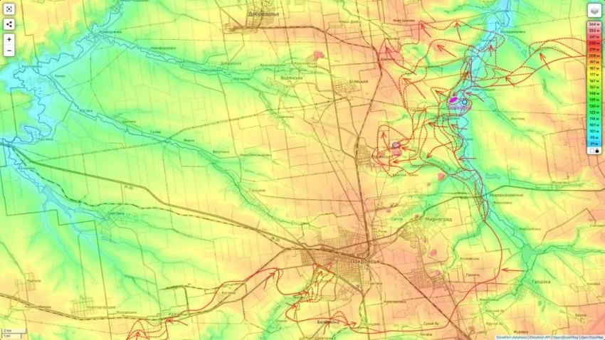 Судя по всему командование ВСУ, понимая катастрофичность положения своей группировки в районе Мирнограда и Покровска перестает обращать внимание на самую дальнюю часть охвата и все силы концентрирует на флангах, чтобы удержать их от распадения.