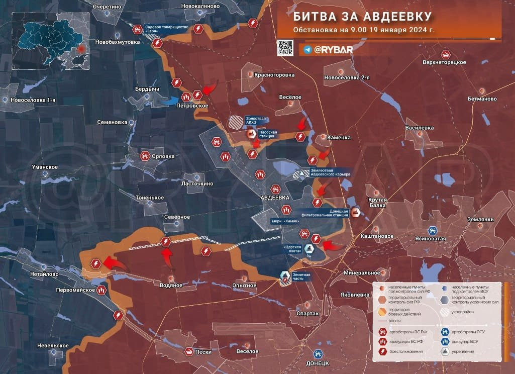Новая карта боевых действий под Авдеевкой на сегодня, 19 января 2024, по данным на 08:00 мск