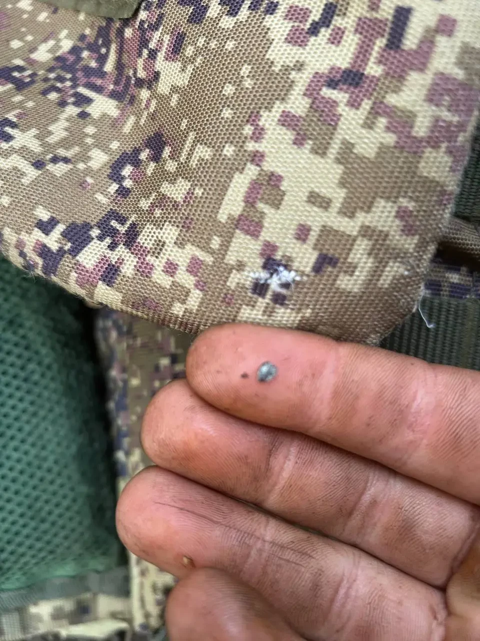 Бронежилет, спасший бойца, и задержанный им осколок, июль 2025 г.