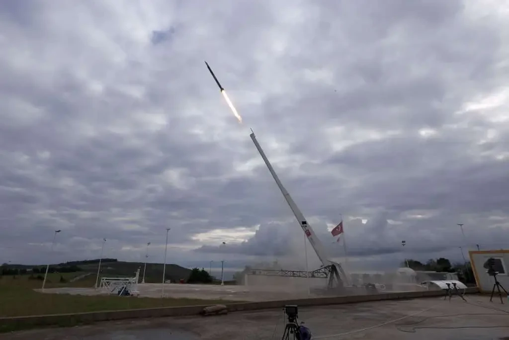 В феврале 2025 г. на одном из турецких полигонов состоялись первые испытания новой ракеты. Тестовый запуск провели при помощи стационарной установки с длинной рельсовой направляющей. Старт осуществлялся с большим углом возвышения.