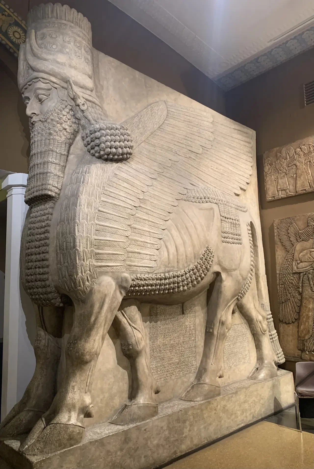 Сегодня мы продолжаем знакомство с экспонатами музея им. Пушкина в Москве, и путь наш лежит в зал истории Месопотамии, вход в который охраняется парой огромных крылатых быков-шеду с человеческими головами. А еще на стенах под самым потолком выставлены слепки с ниневийских барельефов, оригиналы которых хранятся в Британском музее в Лондоне. Глядя на них, и не скажешь, что это копии, а не подлинники. Но информации в них заключено вполне достаточно. Вот, например, здесь очень точно передан внешний вид именно ассирийской колесницы и нескольких ассирийских воинов…