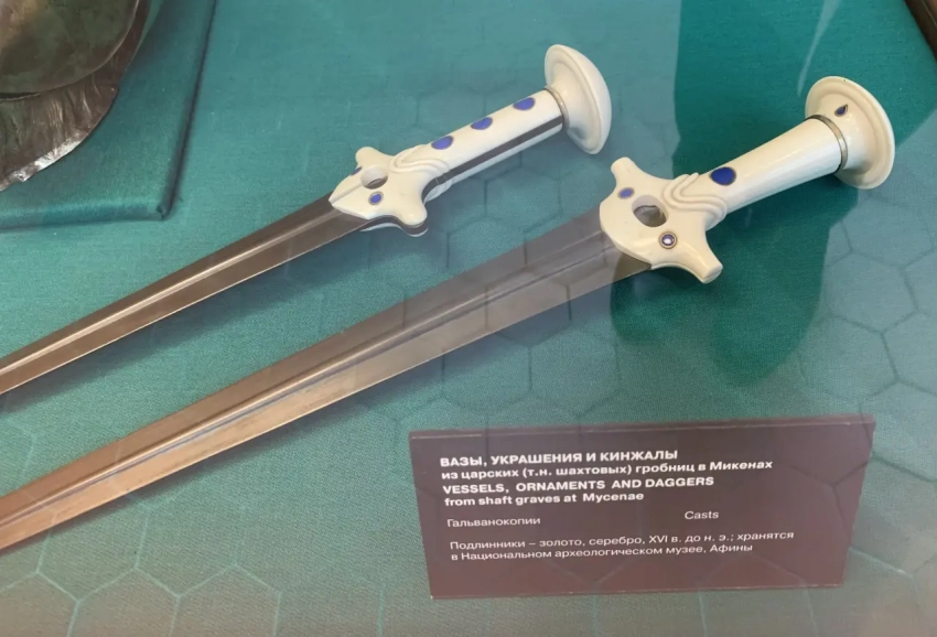 Прекрасно изготовленные копии бронзовых кинжалов из Микен, XVI в. до н.э. Подлинники – в Национальном археологическом музее в Афинах