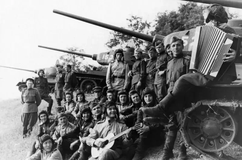 Танкисты 6-й гвардейской танковой армии возле Т-34-85 отдыхают с музыкой на побережье Ляодунского залива. 22 августа 1945