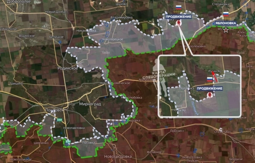 На западном фланге Покровского направления российские войска продвигаются в кармане между Котлино и Зверево, а также вдоль дороги на Чунишино, расширяют зону контроля в Леонтовичах и в Троянде. Фиксируется продвижение ВС РФ в Зеленовке и в южном микрорайоне Покровска - Лазурный. Наши продолжают находить бреши в обороне города, проникая на восточные окраины и даже в центр Покровска. На северном охвате города, судя по вражеским источникам, оборона противника близка к обрушению. Так, уже третий день сообщают о наших ДРГ в районе Золотого Колодезя, а сегодня появились данные и о проникновении наших в Доброполье. Кроме этого, заявляется, что армия России атакует Белицкое и Мерцалово (Дорожное), а также широким фронтом продвигается по рубежу Ивановка-Новое Шахово и севернее - по направлению к Кучеров Яру. Российские источники отчасти подтверждают эту информацию.