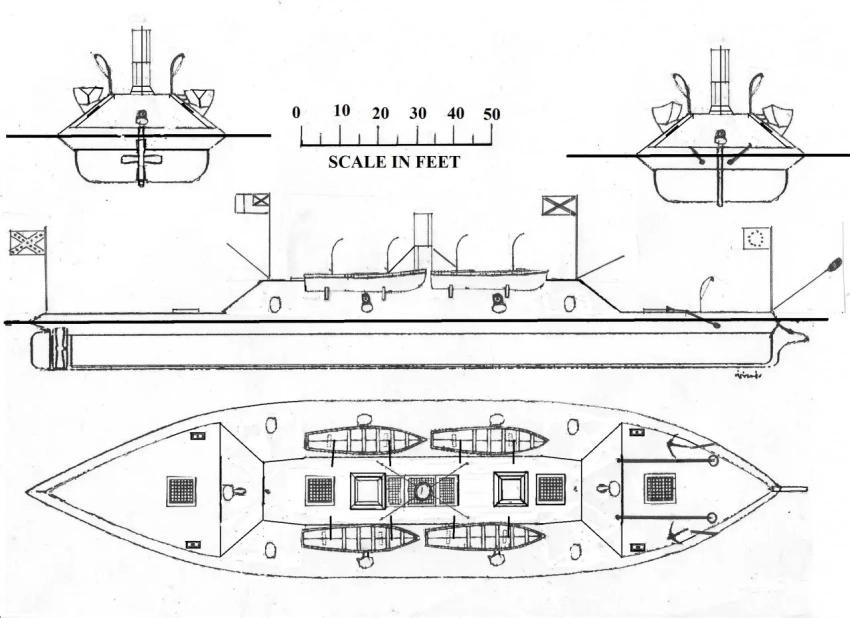 Боковые и задняя стенки каземата и основания кожухов гребных колес корабля защищались всего одним слоем плит толщиной 50 миллиметров. Чтобы повысить снарядостойкость, им был придан уклон в 35 градусов к горизонтали. Подобная защита толщиной не более 50 миллиметров уже считалась недостаточной для защиты от мощных орудий северян, но южане, страдавшие от крайнего дефицита металла, не имели особого выбора. Частично слабость брони компенсировала мощная деревянная подкладка из 600 миллиметров тика.