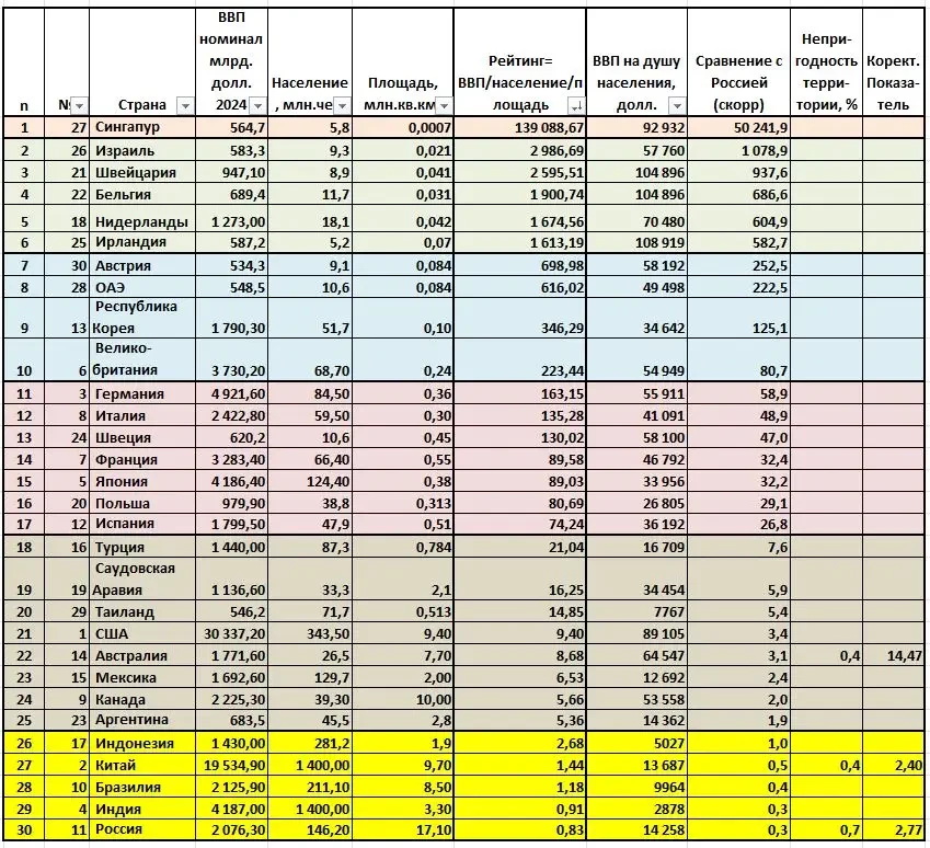 Попробуем сделать расчеты по предложенной модели, взяв за основу страны из ТОП-30 мирового ВВП. Результаты по показателю эффективности — ВВП/население/площадь — оказываются крайне интересными.