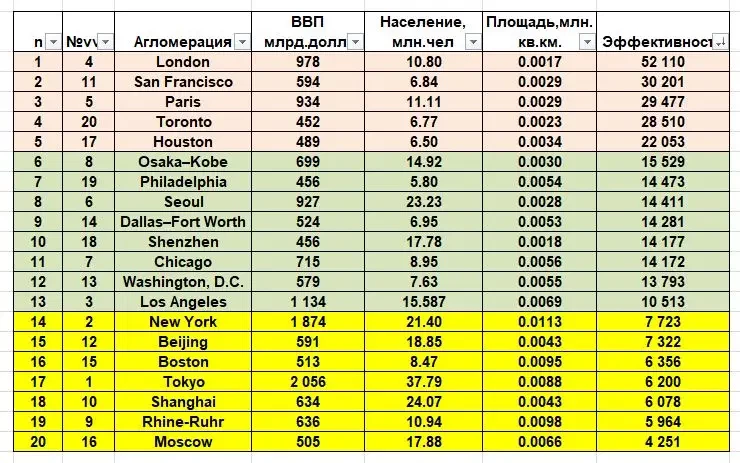 В первой колонке место городов по ВВП (номинал). Москва явно не вторая, а только 16-я. Получаются крайне интересные данные. Самая большая городская экономика мира – Токио – 2 трлн. долл., Нью-Йорк – 1.8 трлн. долл. Но если смотреть по эффективности, безусловным лидером стал Лондон с рейтингом 52 тыс., потом Сан-Франциско – 30 тыс., далее – Париж – 29 тыс. Но если отнести Сингапур в категорию городов, он и здесь будет на первом месте с показателем 139 тыс. А Нью-Йорк, занимая по ВВП второе место, поднялся в рейтинге лишь немногим выше Москвы – 14. Здесь Москва по эффективности использования ресурсов находится на последней строчке, уступая лидерам (Лондон и Сан-Франциско) в 7-10 раз.