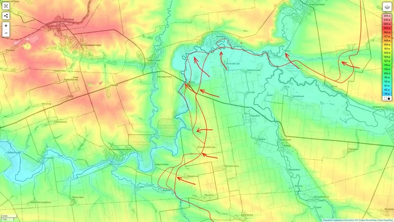На опубликованной карте видно, что российские войска продвигаются с северо-востока к Васильевке, откуда могут повернуть на юг к Гришино и полностью перерезать трассу Днепропетровск - Красноармейск.