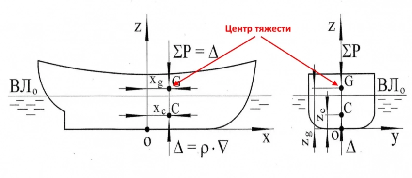 Как вообще возникает крен и дифферент? У любого корабля есть точка, именуемая центром тяжести. Обычно центр тяжести расположен в диаметральной плоскости, чуть вперед от мидель-шпангоута.
