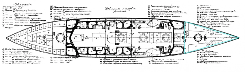 Второй район затоплений – это вода, попавшая ниже жилой палубы в носовых отсеках корабля. В том, что она туда попала, не имеется никаких сомнений: тот же лейтенант М.П. Саблин указывал, что вода, вкатившаяся на жилую палубу через пробоину напротив 1-го ее отсека, «пошла в левый носовой 6-дм погреб и в подбашенное отделение». Другой очевидец тех событий, минно-машинный кондуктор Заварин, наблюдал воду в отделении минных аппаратов и в подбашенном отделении.