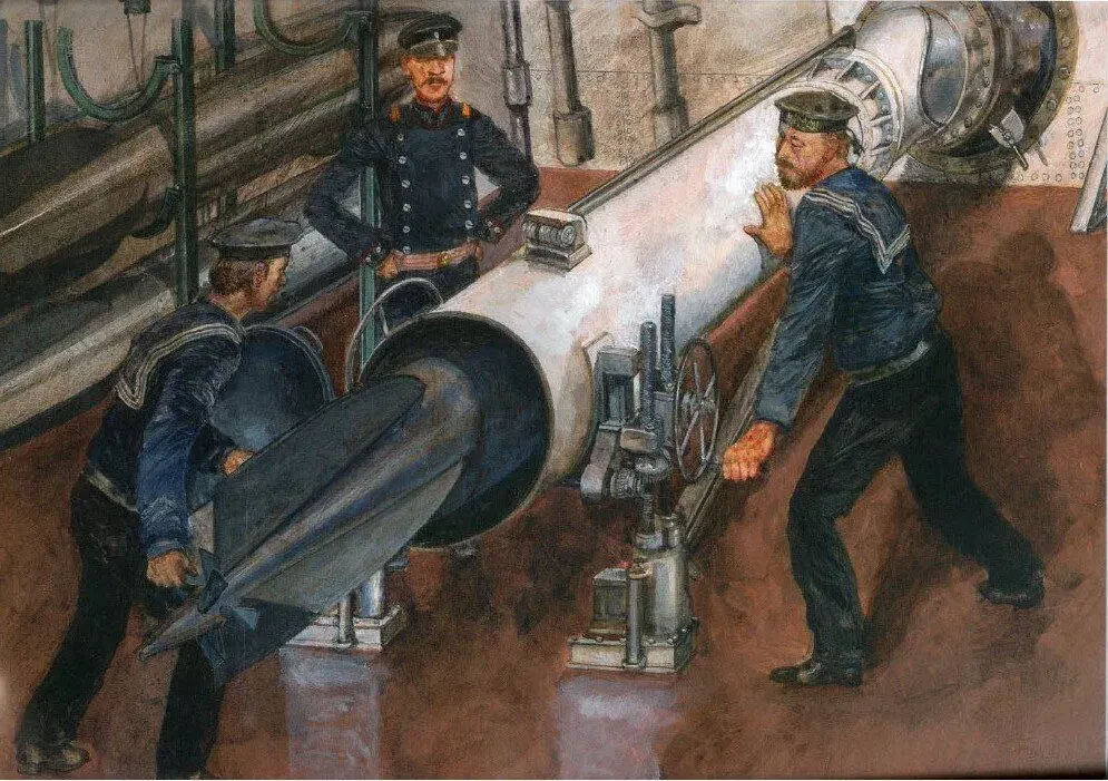 Торпеда Уайтхеда в компании торпедного аппарата его же конструкции