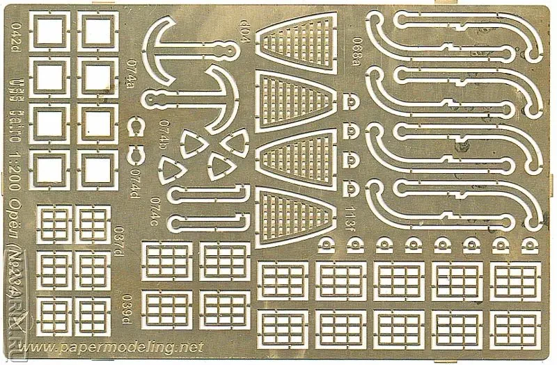 Таковыми, в принципе, были все бумажные модели прошлого века, разве что бумага на многих из них была довольно рыхлой. Зато сегодня такой бумаги в наборах уже нет. Мало того, появились производители, использующие современные технологии для изготовления дополнительных деталей бумажных моделей. Прежде всего, это комплекты лазерной резки. Обычно в этой технике делается «скелет судна» и его основные надстройки. Очень хорошо, что придумали еще и лазером не только вырезать детали моделей, но и гравировать палубы. Конечно, имея в руках бумажные палубы, вы всегда сможете наклеить на них «доски» из полосок шпона шириной 1,5–2 мм. Отдельные их неровности и шероховатости только лишь придадут вашей модели реализма, однако лазерная гравировка и очень красиво смотрится, и… экономит вам время на изготовление модели. Основной дополнительный материал для того же набора судна – шпангоуты и диаметральная плоскость – это картон: 0,5 мм, 1 мм и 1,5 мм. Добавляются к наборам сегодня и металлические детали «фототеч», полученные методом фототравления тонкого металла – обычно латуни.