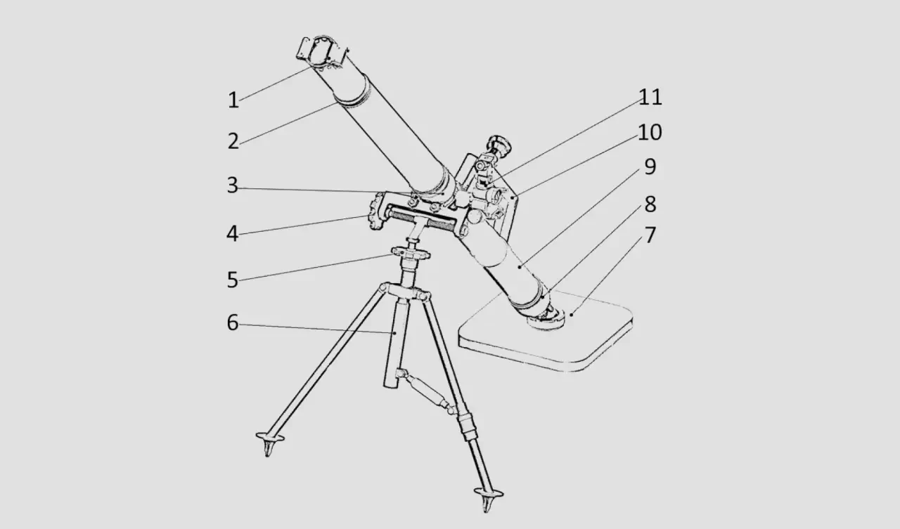 60-мм миномет МЗ-217 «Смолка». 1 – предохранитель от двойного заряжания, 2 – соединительная муфта, 3 – обойма с амортизатором, 4 – рукоятка горизонтального наведения, 5 – рукоятка вертикального наведения, 6 – двунога-лафет, 7 – плита опорная, 8 – казенник, 9 – труба, 10 – тактическая рукоятка, 11 – прицел МПМ-44М