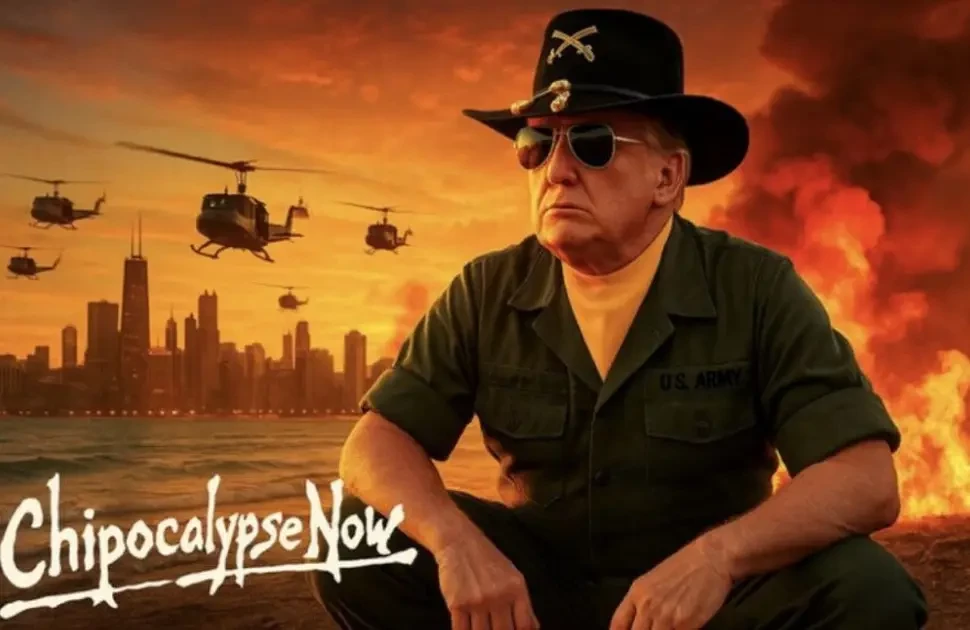По своему обыкновению, Трамп опубликовал в своей социальной сети картинку, на которой он изображен в виде героя известного фильма «Апокалипсис сегодня», признававшегося в своей любви к запаху напалма после уничтожения очередной вьетнамской деревни. Свой портрет на фоне пожаров и летящих вертолетов Трамп подписал: «Люблю запах депортаций по утрам».