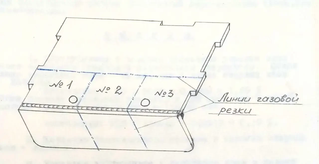 «Цель испытания: поломкой под прессом сварных соединений узла проверить качество сварных швов в изломе, выполненных автоматической сваркой. Для отработки режимов автоматической сварки листов носа был сварен типовой образец длиной 500 мм. Сварка образца производилась на автомате АБС сварочной проволокой 6-5 мм марки ЭИ-613 под флюсом марки АН-22.