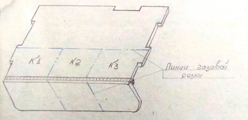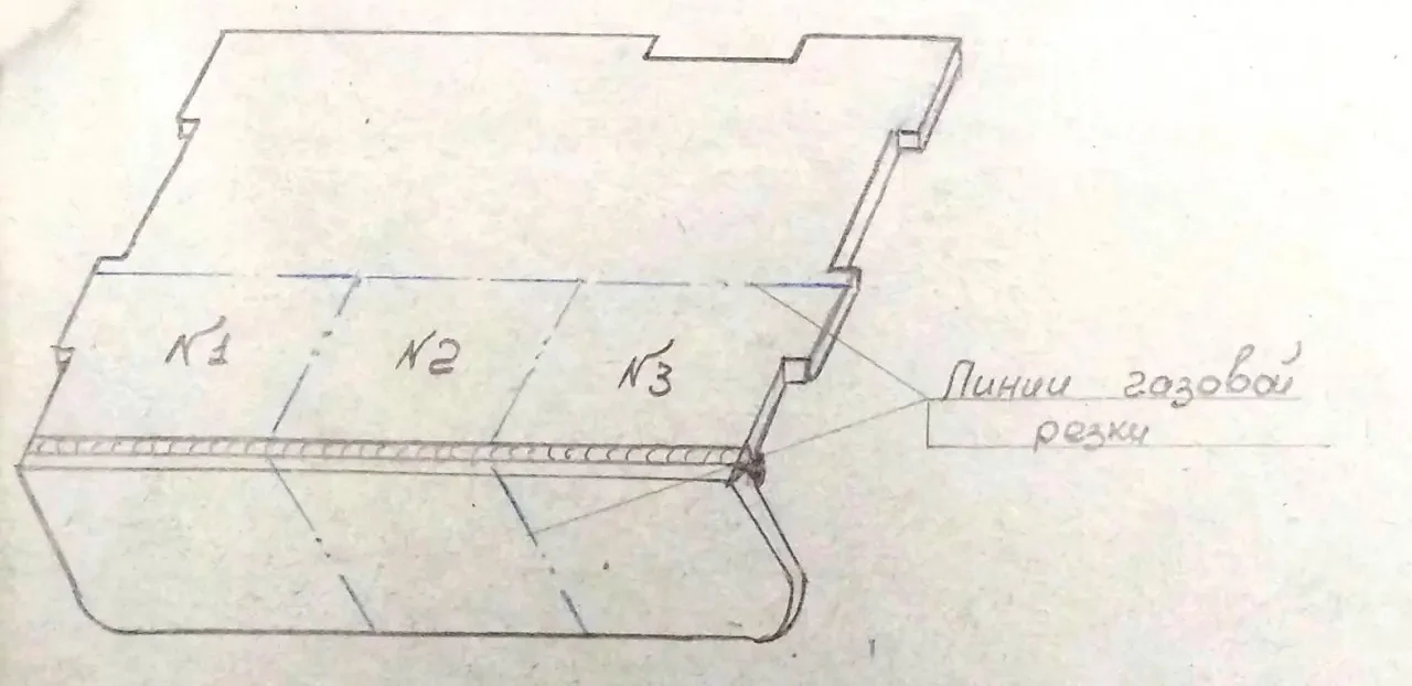 При просвечивании в наружном сварном шве предполагался дефект в виде трещины. При поломке узла "НОС" в месте предполагаемого дефекта при просвечивании выявлен подкол по основному металлу. Для облегчения поломки и получения изломов по сварным швам узел был прерван газовой резкой на три разных участка, которые затем были поломаны под прессом.