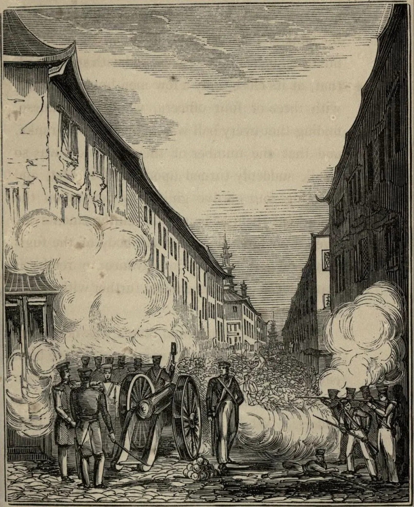 Британцы решили преследовать отступающих, но в сельской местности успехи у них были значительно жиже, более того, 29 мая толпа из 20 тысяч китайских крестьян с ножами и самодельными пиками окружила отряд из 60 сипаев, загнала их на рисовые чеки и осаждала там два часа, убив четверых и ранив порядка 20 человек. Когда на помощь сипаям пришло подкрепление, солдаты смогли отступить в захваченный накануне форт, который также был осаждён крестьянами (китайские источники уверяют, что один из солдат изнасиловал жену местного жителя Вый Шаогуана, потому крестьяне так и взбеленились). Генерал Хью Гоф, главнокомандующий британскими войсками в Китае, направил сообщение губернатору Гуанчжоу Юй Баочуню, что если толпа не разойдётся, то он сравняет Кантон с землёй, и тот призвал крестьян разойтись. Мелкий эпизод, но в современном Китае его раздули до полноценного национального мифа: народное сопротивление захватчикам и трусливый цинский чиновник, призывающий героических крестьян разойтись...
