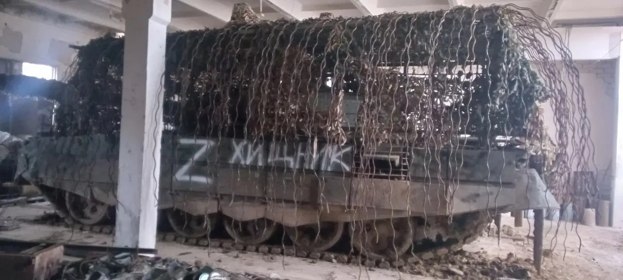 Решение нашлось быстро. Так как танк по сути был лишён возможности вести огонь, его превратили в натуральный самоходный ангар, наварив на него каркас и установив на него металлические листы почти вкруговую. Эффект от появления такого монстра на поле боя был как медийный, так и практический — удалённый от основной брони экран в виде своеобразного ангара сделал машину почти неуязвимой для FPV-дронов, что стало поводом для широкого распространения подобных конструкций.