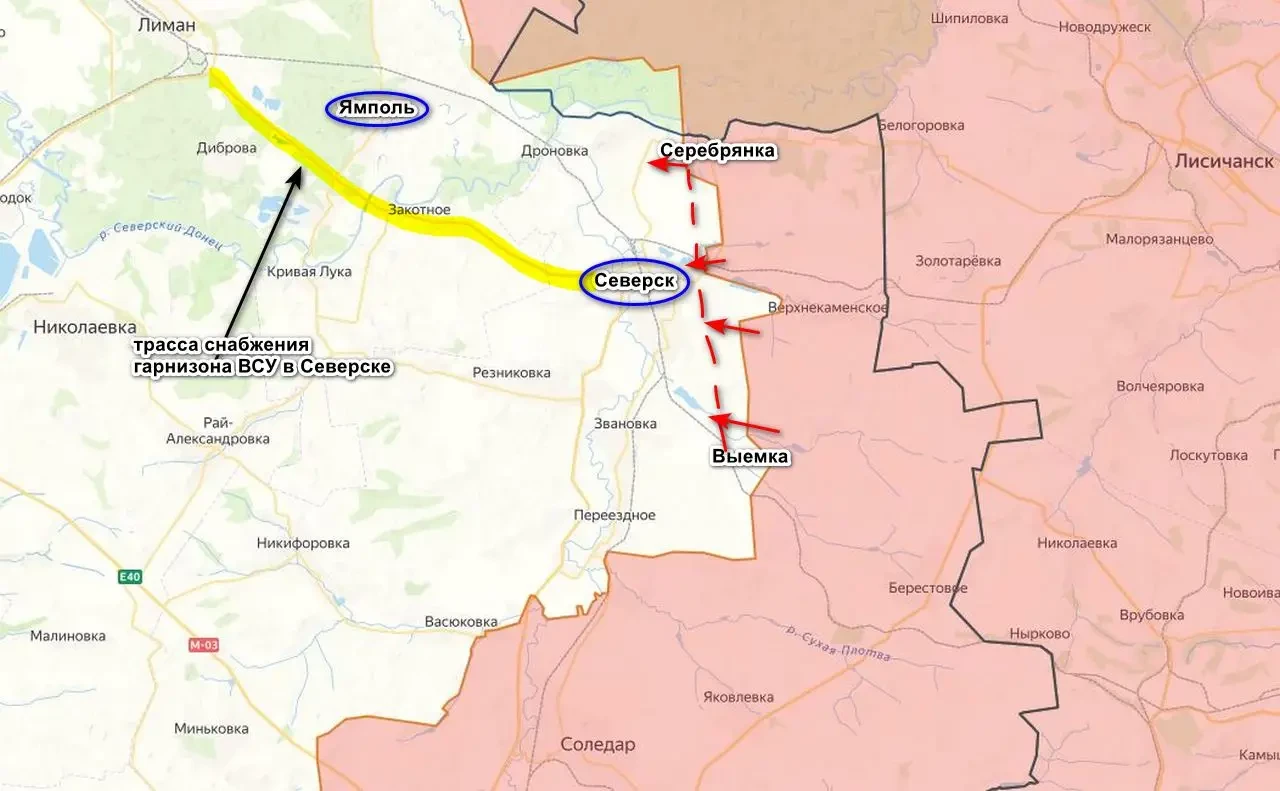 Наступление российских войск на Северск продолжается, на данный момент ближе всего штурмовики ВС РФ подошли к городу с восточного направления. Также угроза создается и с севера, где ВС РФ выбивают остатки ВСУ из Серебрянского лесничества, практически заходя украинской группировке в Северске в тыл. Ситуация для ВСУ осложняется тем, что сам город расположен в низине, а господствующие высоты постепенно переходят под контроль россиян.