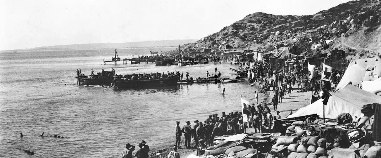 Высадка солдат австралийского и новозеландского корпусов на полуострове Галлиполи в районе мыса Геллес