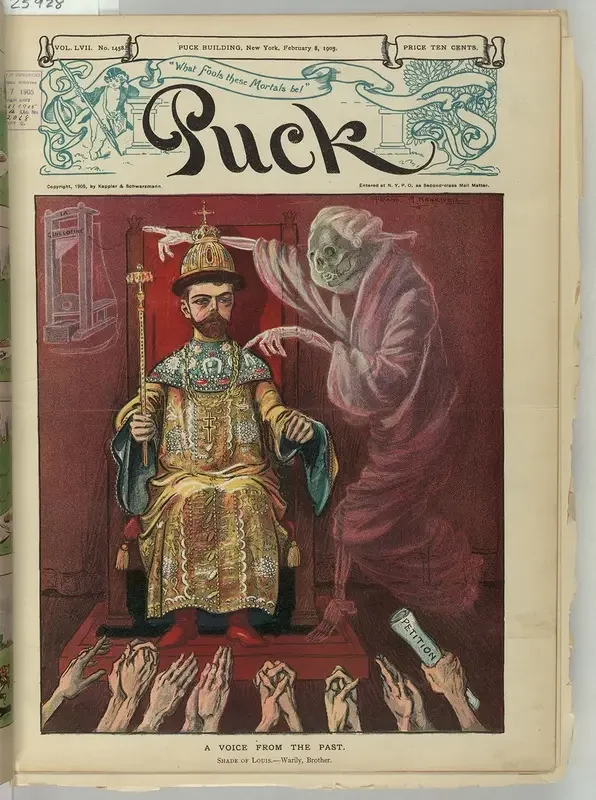«Голос из прошлого»: тень Людовика XVI указывает Николаю II на гильотину и говорит: «Осторожнее, брат». Карикатура американского журнала «Пак».
