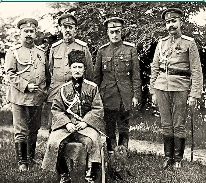 Главнокомандующий Юго-Западным фронтом А.А. Брусилов с сыном и офицерами штаба, 1916 г.