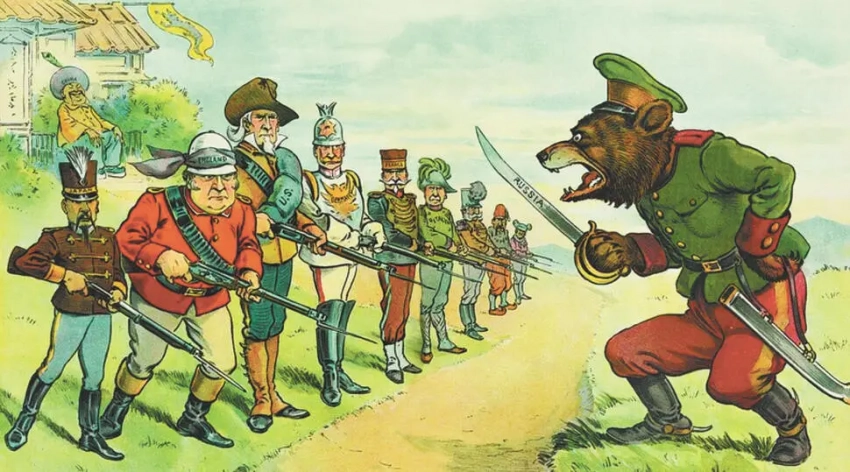 Паровым катком на этой карикатуре по старой европейской традиции управляет русский медведь