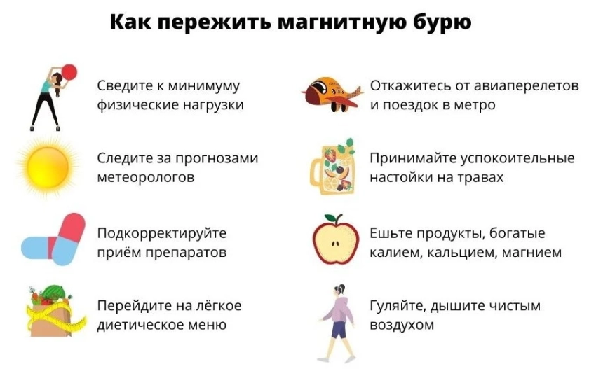 Эксперт советует обращать внимание на своё состояние во время магнитных бурь и при необходимости принимать меры для минимизации негативного воздействия, включая соблюдение режима дня, использование релаксационных техник и, при необходимости, обращение к врачу за коррекцией препаратов.