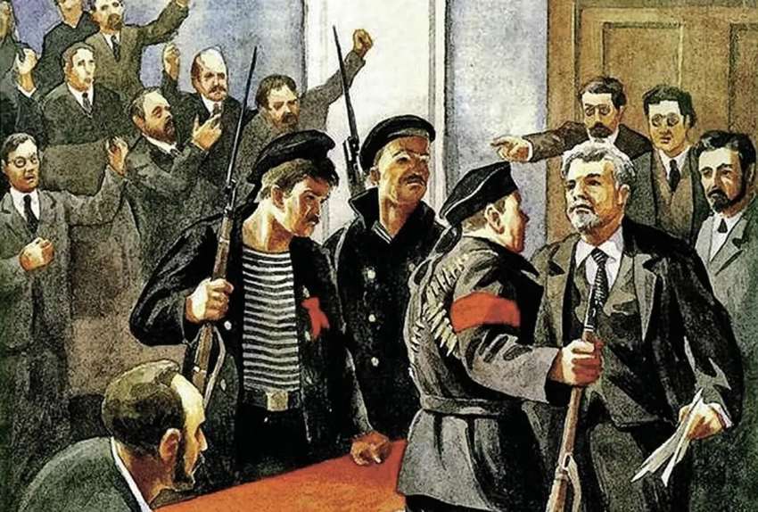 «Начальник караула – матрос линкора “Республика” А. Железняков, разогнавший Учредительное собрание»; картина кисти Ю.К. Арцыбашева