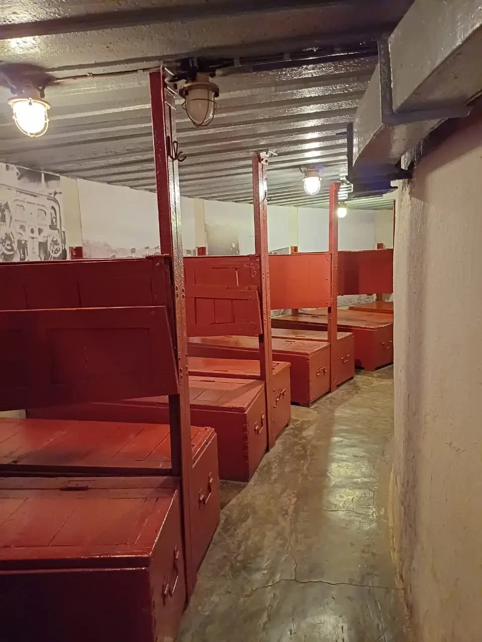Для расчётов башенных установок, непосредственно задействованных в боевой работе, на первом подземном этаже имелись спальные полки и рундуки, места приёма пищи, а также служебные помещения командиров.
