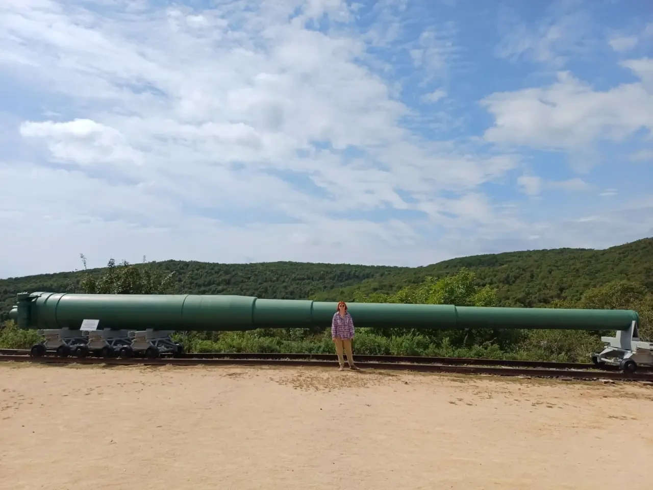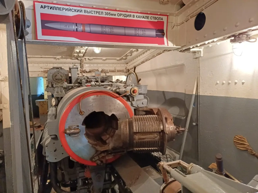 На фотографии наглядно видны размеры 305-мм орудийного ствола, рядом с которым стоит моя супруга. Также впечатляют габариты казённой части и затворов 305-мм орудий, отделённых между собой перегородками внутри башни.