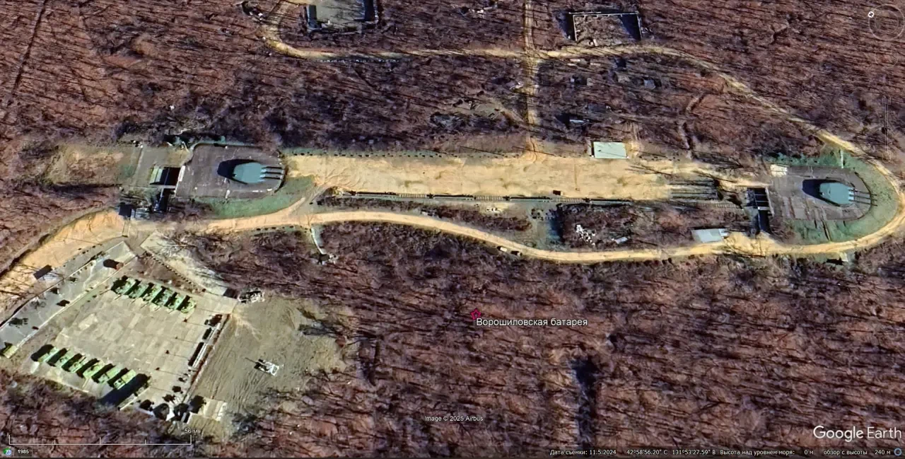 Спутниковый снимок Gоgle Earth: территория музея «Ворошиловская батарея» и филиала парка «Патриот». Снимок сделан в ноябре 2024 года
