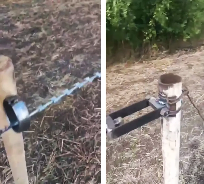 На другом конце проволоки - столбик с очередным самодельным «механизмом» - креплением с вращающимся от вращения самой «егозы» болтом. Общая длина проволоки - более 100 м.