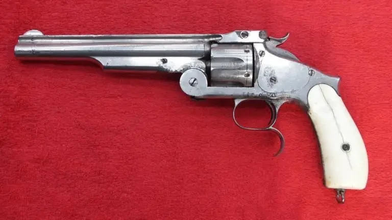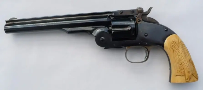 Гражданская модель. Рукоятка имеет обкладки из слоновой кости, корпус никелирован. Производство «Смита и Вессона оружейная фабрика г. Спрингфильдъ, Америка. Русская модель» (текст на английском)