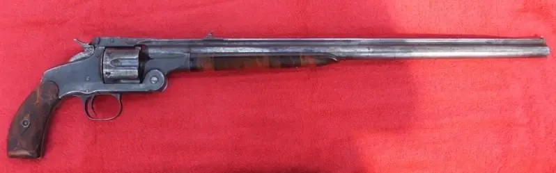 Револьвер «Смит и Вессон» калибра .44 несамовзводный, шестизарядный, известный в России как «4,2-линейный револьвер Смит и Вессона I образца». Длина ствола: 167 мм. Начальная скорость пули: 210 м/сек. Пробивное действие: на 25 шагов пробиты 3,65-дюймовые сосновые доски; на 50 шагов – 2,75, и на 100 шагов – 1 доска в 25 мм. Скорострельность: 6 выстрелов за 10 секунд. Производства Тульского оружейного завода