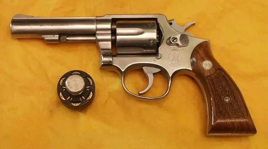 «Смит и Вессон» Модель 64. Военный и полицейский револьвер, изготовленный из нержавеющей стали с шестизарядным барабаном под патрон .38 Special. Модель 65 выпускалась с 1972 года до 2004-2005 гг. Начиная с 1980 года компания также выпускала револьверы под патроны .357 Magnum со «средне-крупной» рамой («L-рамой»), которая лучше справлялась с высокими нагрузками при стрельбе из револьвера большого калибра. Револьвер с крупной рамой из нержавеющей стали получил название «Модель 686». Рядом спидлоудер – ускоритель заряжания