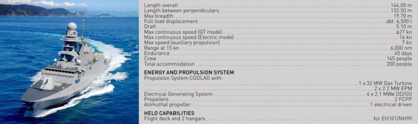 Фрегаты класса Bergamini имеют длину 144 м, водоизмещение около 6500 тонн при полной загрузке, используют малошумные дизель-генераторы и развивают скорость около 27 узлов, дальность плавания превышает 6000 морских миль. Существует два варианта комплектации: в конфигурации общего назначения, оптимизированной для нанесения ударов и патрулирования, и в противолодочном исполнении. Какая именно версия интересует Афины, пока неизвестно.