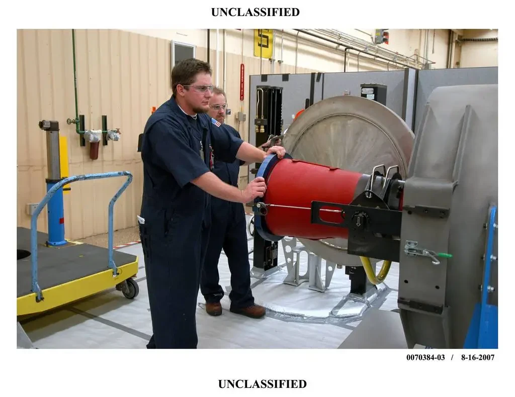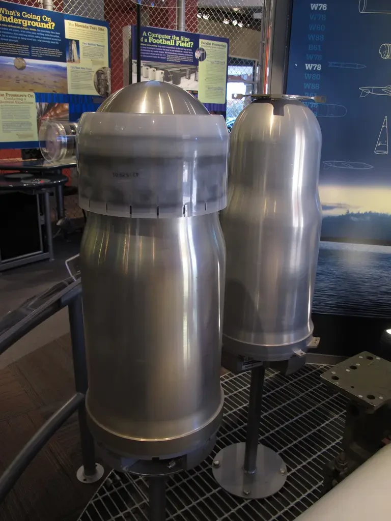 На снимке две ядерные боеголовки W80, на переднем плане W80-0 к ракетам BGM-109A «Томагавк», её отличает 100-фунтовое титановое кольцо с берилиевым покрытием вокруг первичного модуля для защиты членов экипажа ПЛАТ типа «Лос-Анжелес» первого (торпедного) отсека от радиации, их спальные места размещались под капсулами с ракетами, вторая боеголовка W80-1 к ракете воздушного базирования AGM-86B ALCM-B