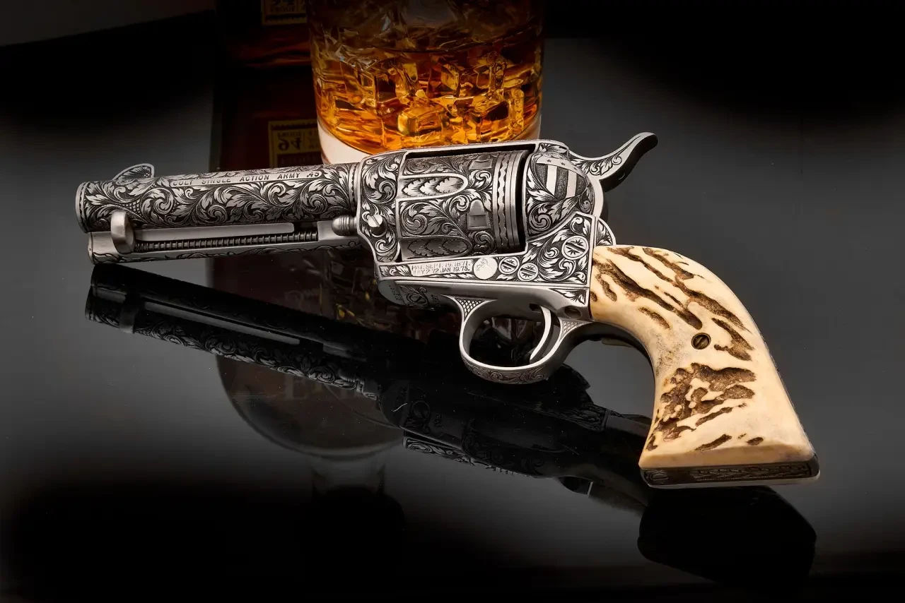 Есть среди оружия компании также и револьверы. Вот, например, армейский «Кольт» одинарного действия, гравер Бен Шостл. Производство компании SK Guns