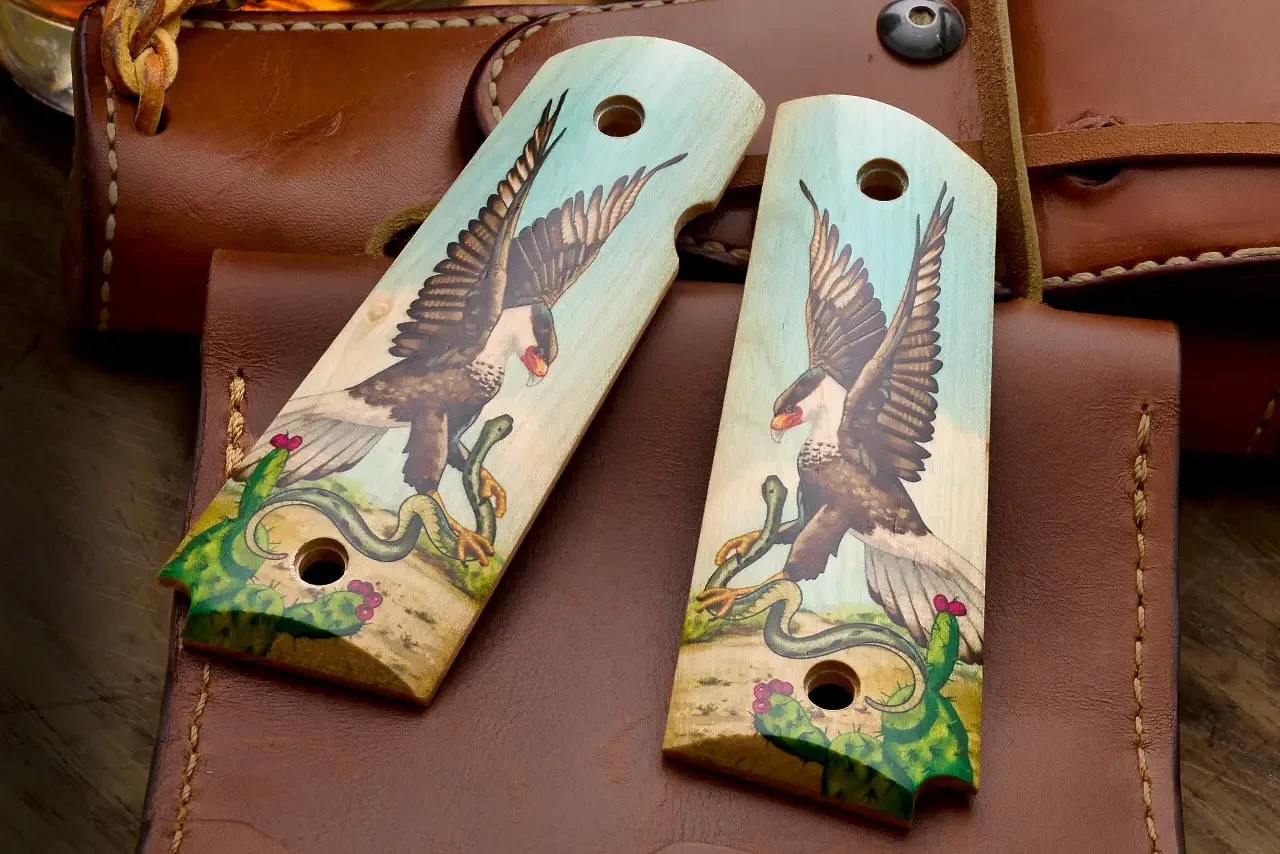 Пистолет, посвященный культуре древней Мексики. Даже на накладках рукоятки мы видим изображение орла терзающего змею, очень древний ее символ, украшающий также и герб этой страны. Производство компании SK Guns